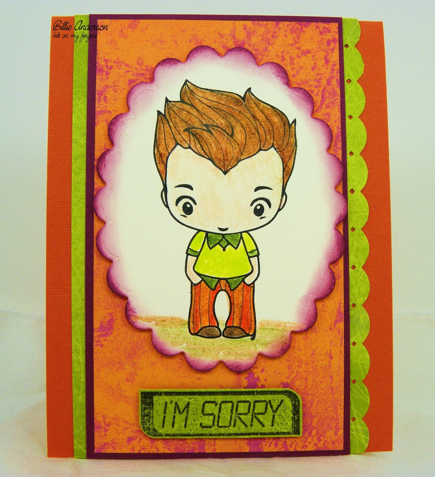 Used: orange card stock Tuesday morning, rich razzleberry, very vanilla SU, designer paper not sure who it's from. Edward stamp from The greeting farm, word from Club scrap, colored with pencils, inside of the card used colors from the front and thought the rose from G company was a nice SORRY touch.