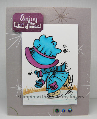 This is Fan SB Winter. I colored her with copics. I created a pond for her to skate on. I added her to a pretty piece of designer paper and stamped and heat embossed the Paper trey ink sentiment. I used Stampin up die to cut it out. I went over the pond with Spectrum Noir sparkle brush and added some Pretty pink posh jewels..