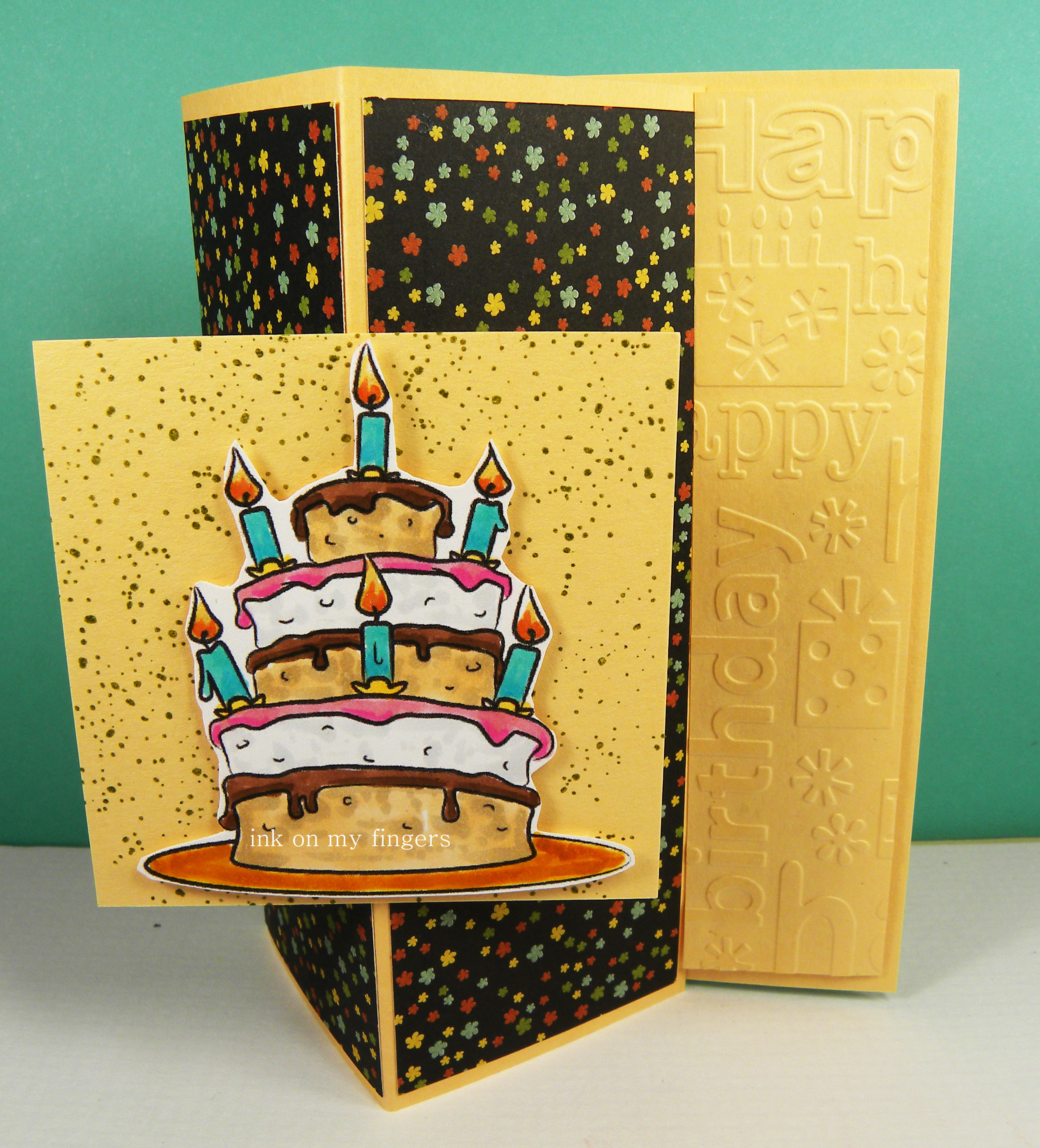 I went with the fancy fold. I used the Cake and Candle image and colored with copics. I chose the SU dp and card stock. I first make the fancy fold before I colored the image. I folded the card as usual then scored down the center of the front. I added my designer papers. I cute another piece of the card base and using SU ink I used a SU over all dot stamp and created the base for the cake to go on. I colored the cake and went over the flames with Spectrum Noir sparkle brush. I fussy cut out and added to the square. Then you cut a piece that is a lot smaller and crease in the center and add it to the base just adding adhesive in the fold area. then you add you image to the strip so it's free on both sides.