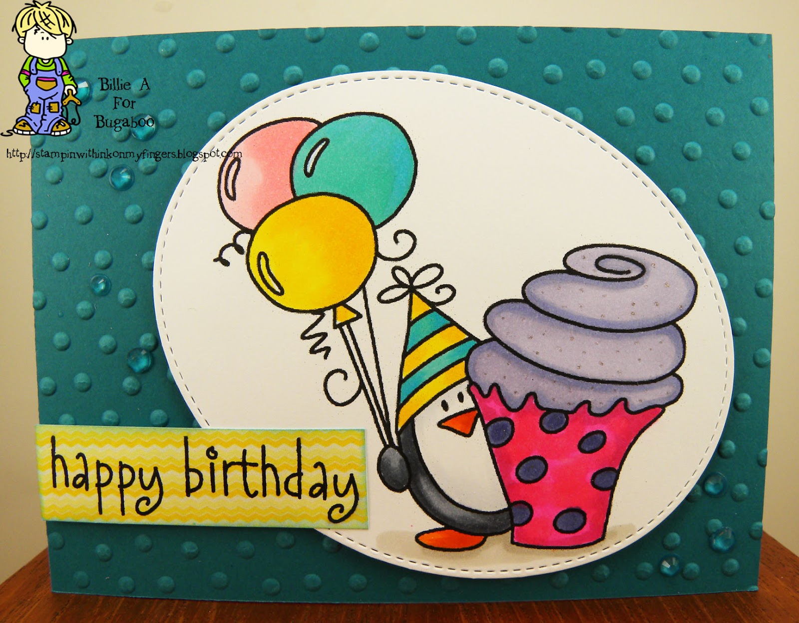 This Free Friday image is called Penguin Cupcake.. I used a large dot embossing folder for the background and a My Favorite Things oval stitch die to cut the image. I colored the image with Copics and added some Gelly Roll pen dots to the frosting on the cupcake. I stamped the Hero Arts birthday sentiment and went around the edge with Quick Quote chalk ink. I added a few clear sequins but they are hard to see. This is a very bright colorful card.